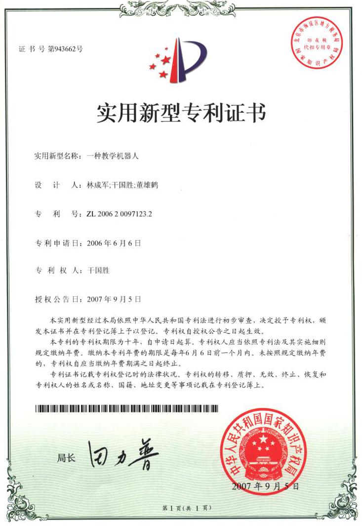 本网讯 (记者 鱼昆 报道)9月5日,国家知识产权局正式授权公告,授予我院计算机工程系副主任干国胜副教授研制的“一种教学机器人”专利权,并颁发了实用新型专利证书。